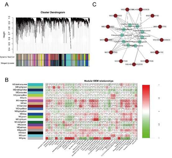 图1 43个芒果品种转录组合代谢组的共表达网络分析