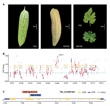 本研究依托高质量基因组构建了一个包含3,223份M₁代材料的大规模EMS突变体库,并对320份突变体进行了全基因组重测序,鉴定出约48万个突变位点。利用该突变体库,研究人员通过MutMap方法快速克隆了控制黄果性状的基因McEGY1。此外,结合BSA和BSR分析,团队还成功定位了控制果实长度(Y52_Chr0202842)、果实瘤状突起(Y52_Chr0400763)和白粉病抗性(Y52_Chr0300357)的关键候选基因。